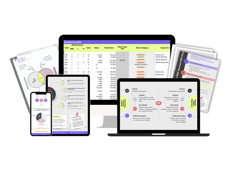 l've taken every hard lesson, every expensive mistake, every "I wish I knew this earlier" moment, the sleepless nights, the costly errors, the client dramas, the vendor nightmares — and turned it into a practical step-by-step system templates and strategies that actually work in the real interior business world.